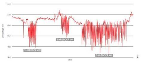 Power quality measurement of the LRS solution reveals other effects on the distribution network. For example, the line RMS value in load condition is characterised by rapid transients (swells and dips), due to rapid shredder load variation. Also, the voltage fluctuation influences other motors/ loads – with additional transients in network current and impact on power quality in the upstream distribution system.