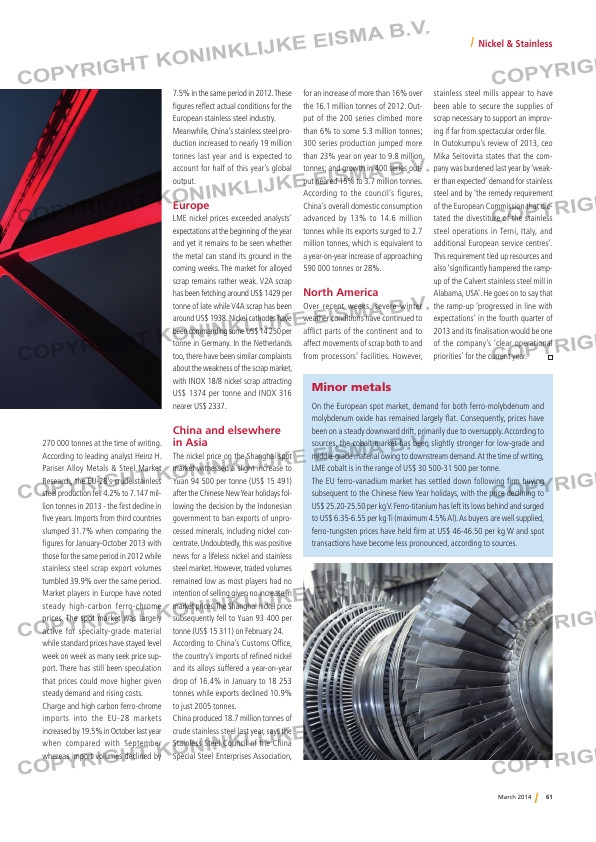 61March 2014 Nickel & Stainless 270 000 tonnes at the time of writing. According to leading analyst Heinz H. Pariser Alloy Metals & Steel Market Research, the EU-28’s crude stainless steel production fell 4.2% to 7.147 mil- l...
