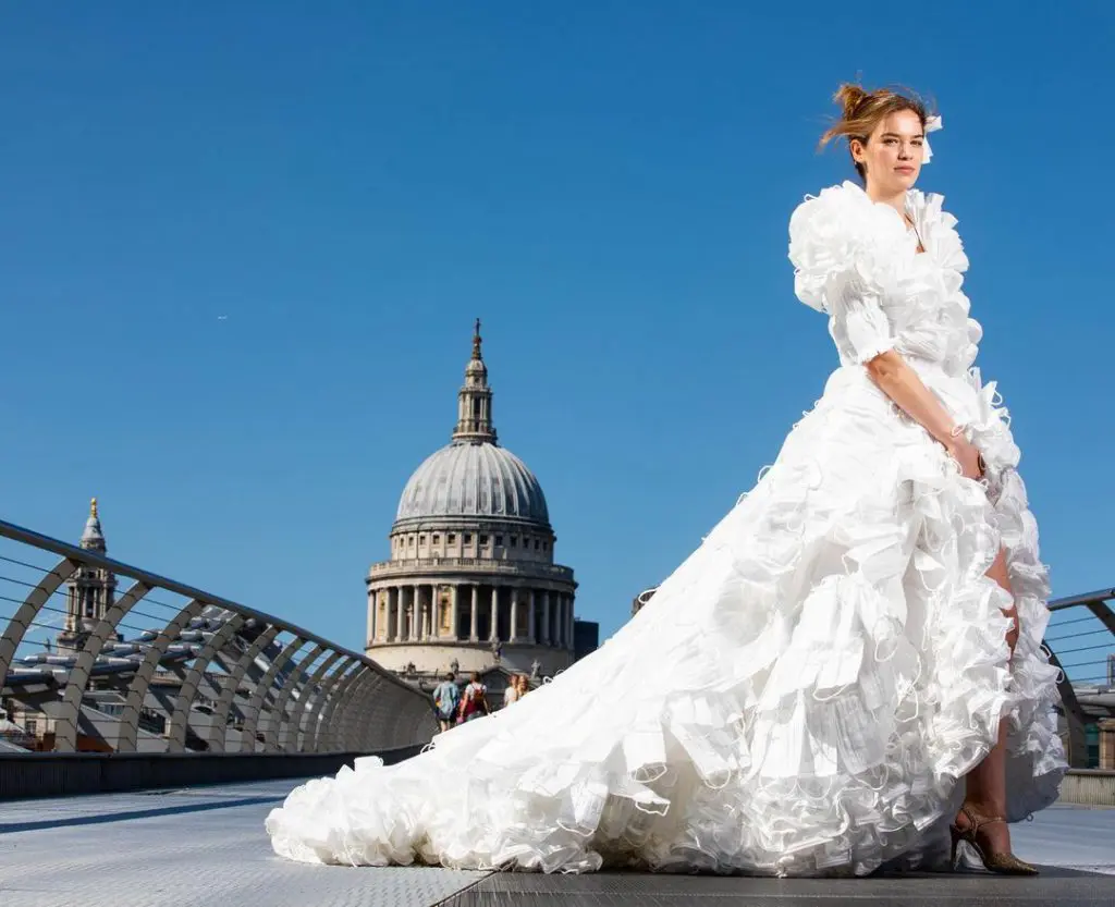 Fast forward to today. 2020 brought a new reality to our doorstep. Millions of face masks are discarded across the world on a weekly basis. UK designer Tom Silverwood has found a way to hit two birds with one stone: by creating a unique wedding dress made from end-of-life face masks to call attention to this modern-day waste stream.