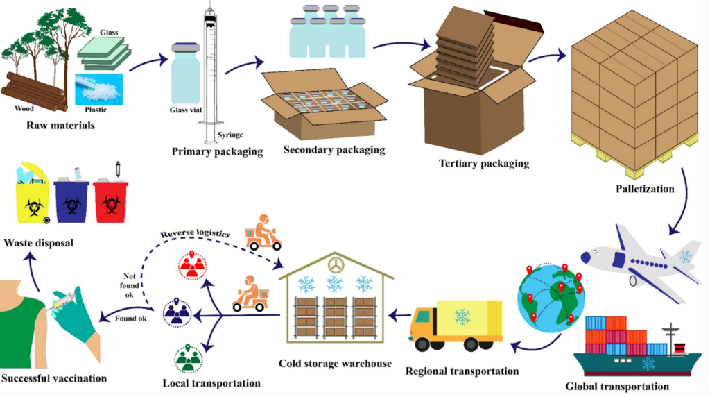 At the start of all this madness, I recall reading about pilot projects at local hospitals to collect syringes, gloves and face masks. What has become of these initiatives? Are there any cohesive numbers stating how much has been collected, where, and what has become of the material? Below is a chart of the complete flow of vaccine packaging and transport.
