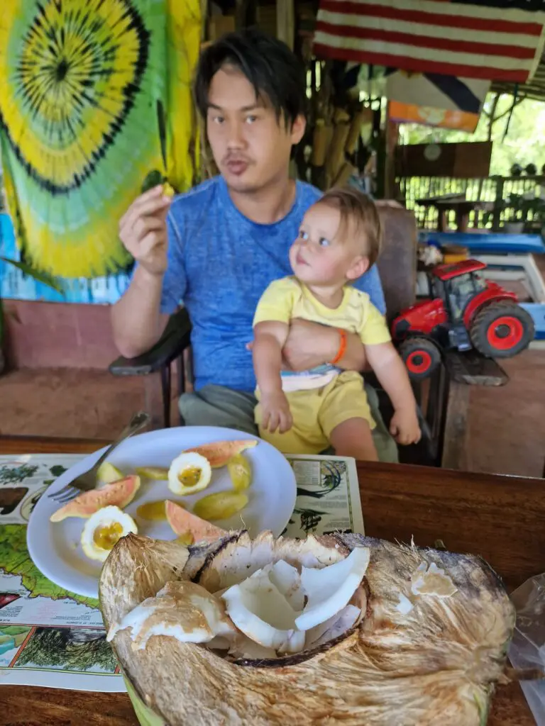 I’ve had many delicious dishes in my life. Nothing quite compares to eating mango, papaya, passion fruit and coconut fresh from the tree! Our son Robin seemed to agree, sampling everything with great enthusiasm.