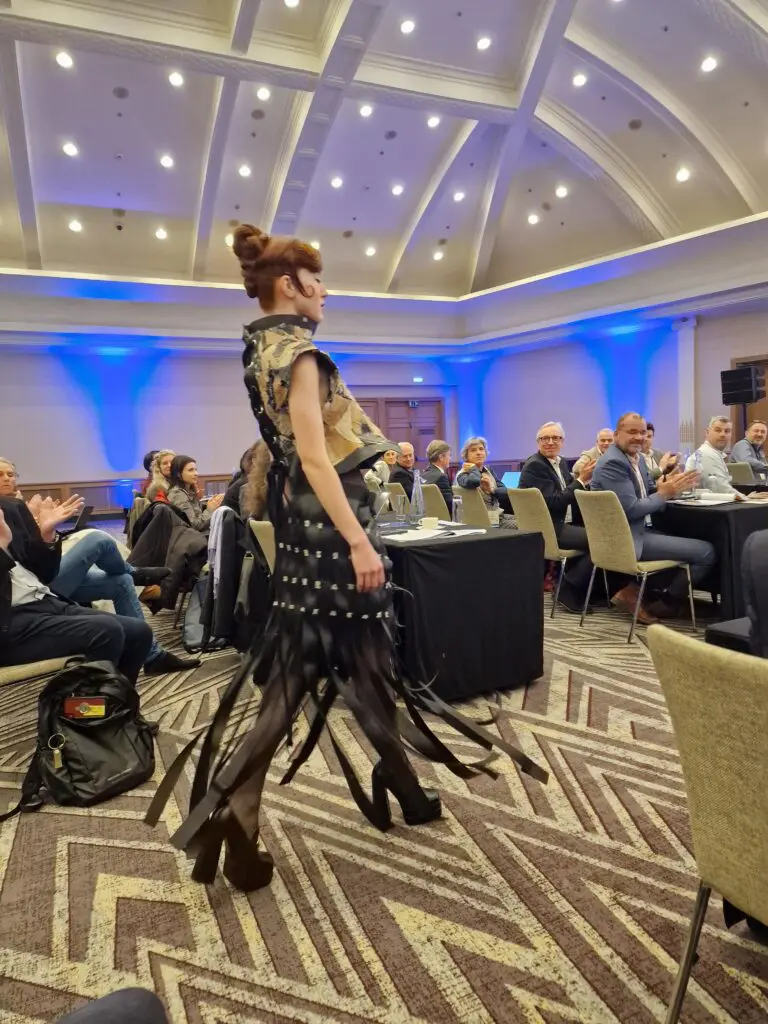 Delegates turn to see a tall woman in high heels walking towards the stage to ‘Hit the Road, Jack’ with an intricate skirt made from car seatbelts trailing behind. Her dark hair is bound together by a crown-like headdress and her torso seems almost poured into a leather-like body armour, fitting like a second skin.