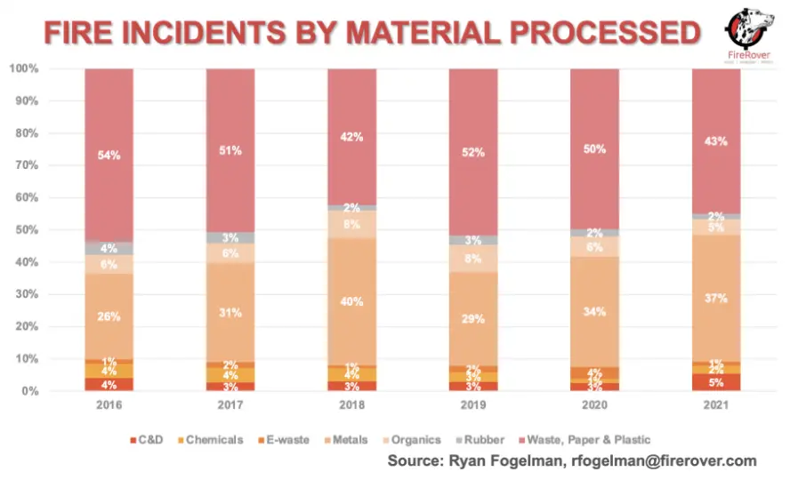 A total of 367 fires occurred at waste and recycling facilities in the US and Canada in 2021. These resulted in two deaths and 37 direct and indirect injuries, according to Ryan Fogelman of tech company Fire Rover.