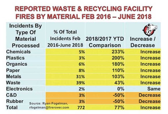 The industry has seen a 77% year-on-year increase in incidents related to fires in the first six months of 2018 alone, according to Ryan Fogelman, and VP of fire safety solutions company Fire Rover. He estimates that the 1800+ fires taking place on average every year translate into almost 40% of waste and recyclign facilities in Canada and America experiencing a fire in the past 12 months.