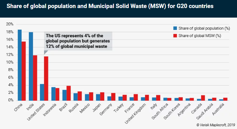 New market data by Verisk Maplecroft urges underlines that the US creates three times the global average of waste. At 773kg per head, the country generates 12% (around 239 million tonnes) of global municipal solid waste. ‘In contrast, China and India make up over 36% of the global population, but generate 27% of global municipal waste,’ market analysts point out.