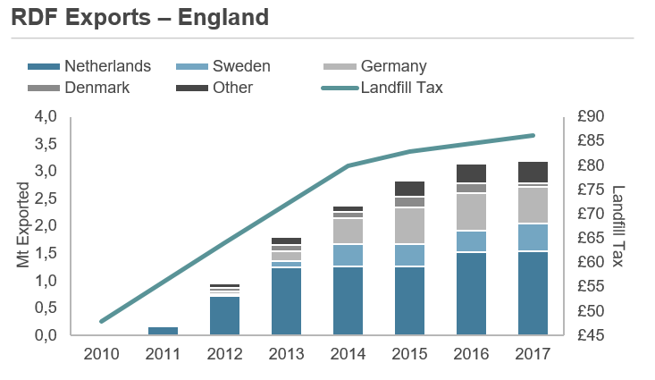 Throughout this century, the UK government has advocated landfill diversion policies: in 2010, 85% of residual waste was landfilled versus 50% in 2016. The UK government introduced an increasing levy on landfilling residual waste and financial support for the Waste Private Finance Initiative resulted in the development of more EfW plants.