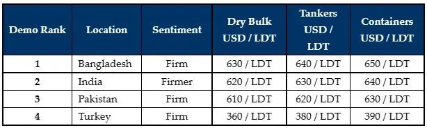Within the sub-continent, Bangladesh continues to lead the market in terms of offered price levels, according to Allied Shipbroking. Given the current Russian-Ukraine crisis that has unfolded, there are also signs of potential increases in their offered price levels in a pro-active stance so as to prevent any potential losses in the flow of units being beached.