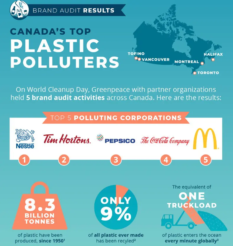Globally, the top five ‘worst polluting companies’ were identified; the Coca-Cola Company was named as the top polluter, followed by PepsiCo., Nestlé, Danone, and Mondelez International. In North America, the ‘worst offenders’ are Nestlé, Tim Hortons, PepsiCo, the Coca-Cola Company and McDonald’s.