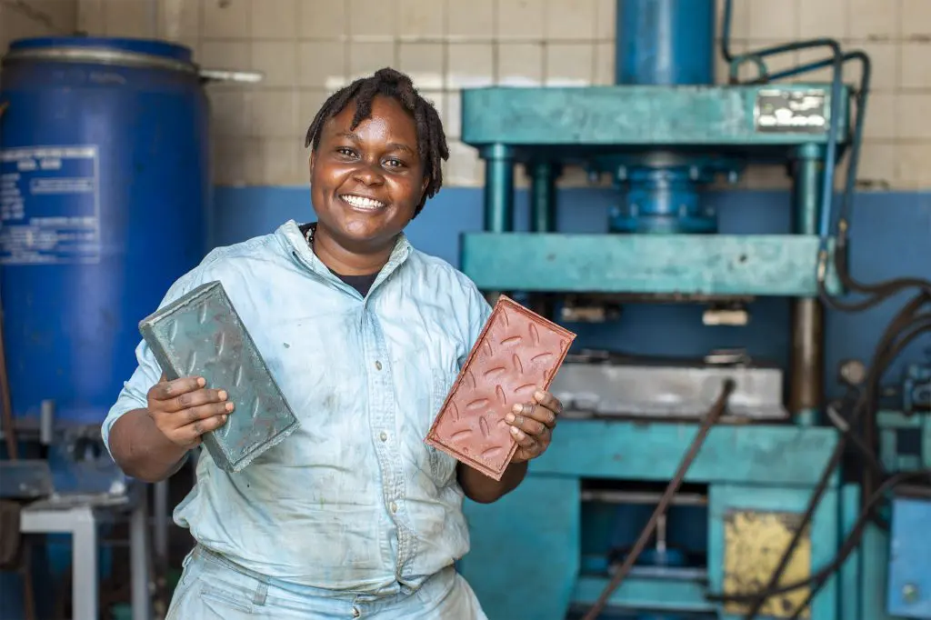 Materials engineer Nzambi Matee’s company recycles plastic scrap and sand into low-cost construction materials. She was one of the winners of the Young Champions of the Earth prize, which is part of the United Nations Environment Programme to engage young people in tackling the world’s most pressing sustainability challenges. Gjenge Makers creates bricks and tiles in various colours (currently red, blue, brown and green) and manhole covers. Mattee says her bricks hold up to five times the weight of comparable concrete blocks.