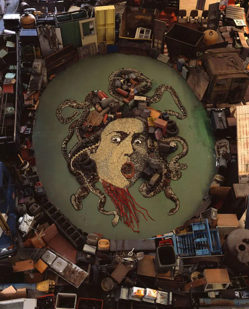 During this cinematic feature, Muniz transformed various types of waste found at the Rio garbage site into ingredients for several different portraits. None other than the local catadores were asked to model for this series. Working from a nearby warehouse, Muniz ‘rented’ over 3600 kg worth of junk that was carefully screened and arranged on the ground by everybody involved.