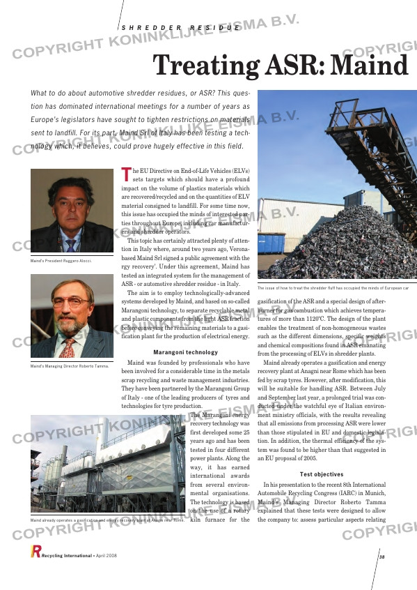 ... to landfill. For some time now, this issue has occupied the minds of interested par- ties throughout Europe, including car manufactur- ers and shredder operators. This topic has certainly attracted plenty of atten- tion in Italy where, aroun...