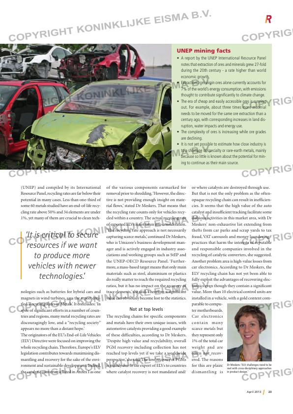 ... 50% and 34 elements are under 1%, yet many of them are crucial to clean tech- nologies such as batteries for hybrid cars and magnets in wind turbines, says the report enti- tled ‘Recycling Rates of Metals’. It concludes: ‘In spi...