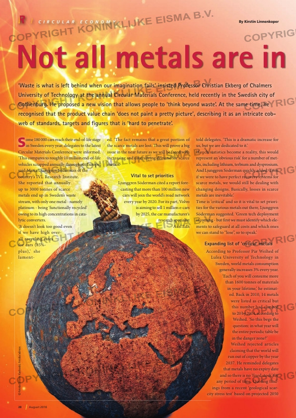 ...ing to its high concentrations in cata- lytic converters. ‘It doesn’t look too good even if we have high over- all recycling rates for cars (85%- plus),’ she lament- ed. ‘The fact remains that a great portion of the scarce metals are lost. T...