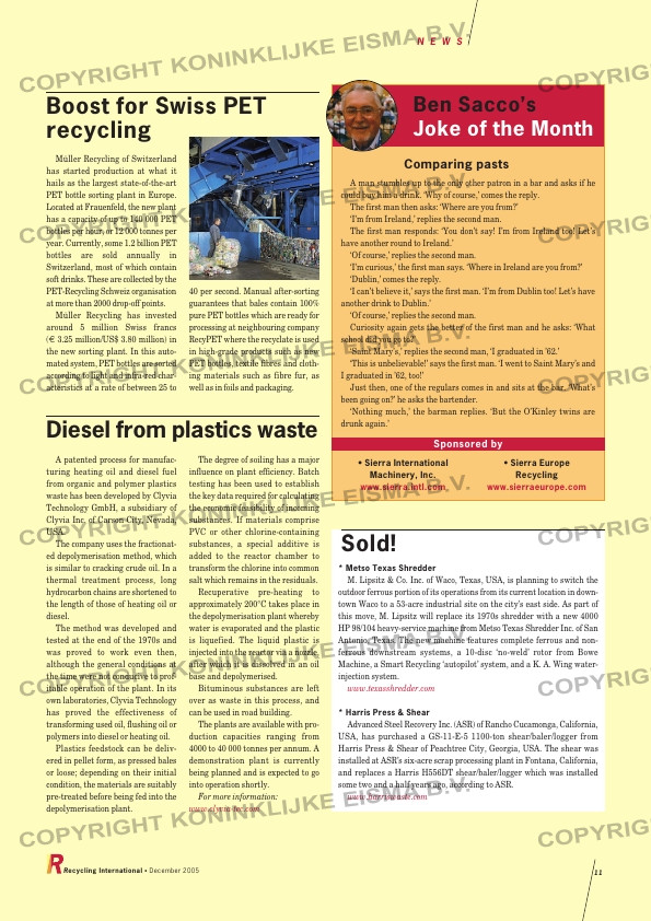 ...These are collected by the PET-Recycling Schweiz organisation at more than 2000 drop-off points. Müller Recycling has invested around 5 million Swiss francs (€ 3.25 million/US$ 3.80 million) in the new sorting plant. In this auto- mated syst...