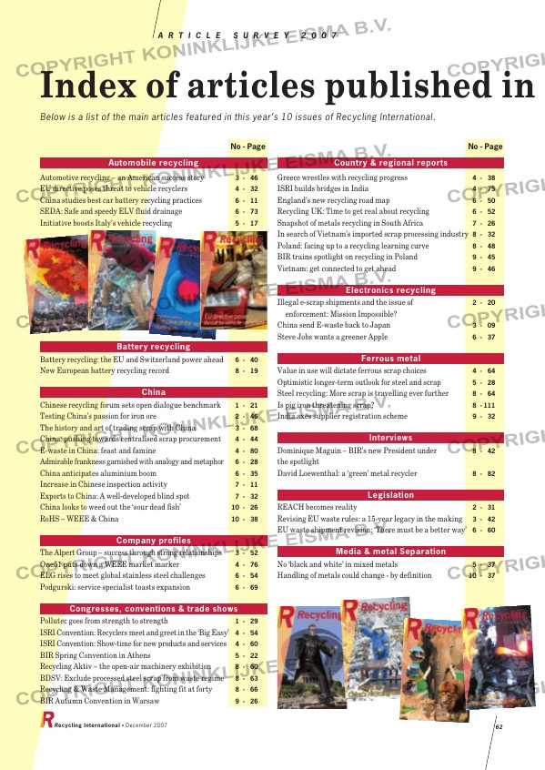 Below is a list of the main articles featured in this year’s 10 issues of Recycling International.
