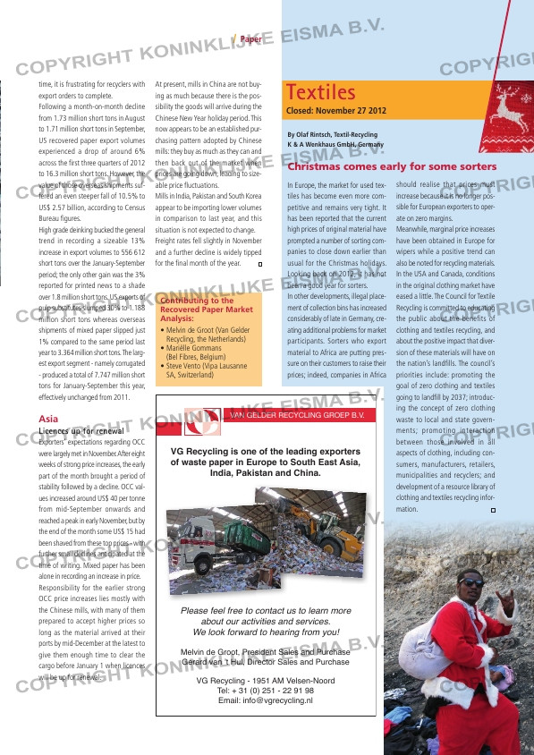 ... so long as the material arrived at their ports by mid-December at the latest to give them enough time to clear the cargo before January 1 when licences will be up for renewal. In Europe, the market for used tex- tiles has become even m...