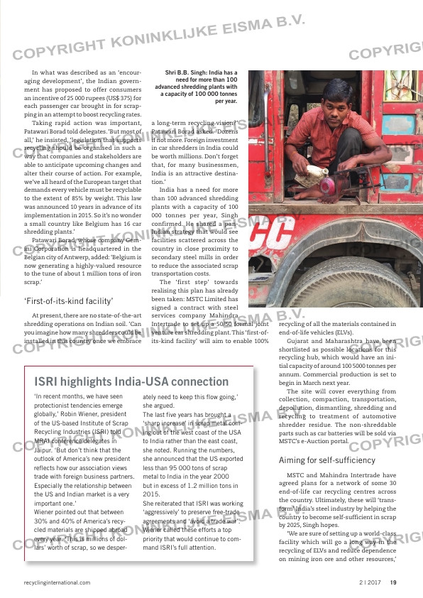 ...mers an incentive of 25 000 rupees (US$ 375) for each passenger car brought in for scrap- ping in an attempt to boost recycling rates. Taking rapid action was important, Patawari Borad told delegates. ‘But most of all,’ he insisted, ‘legislat...