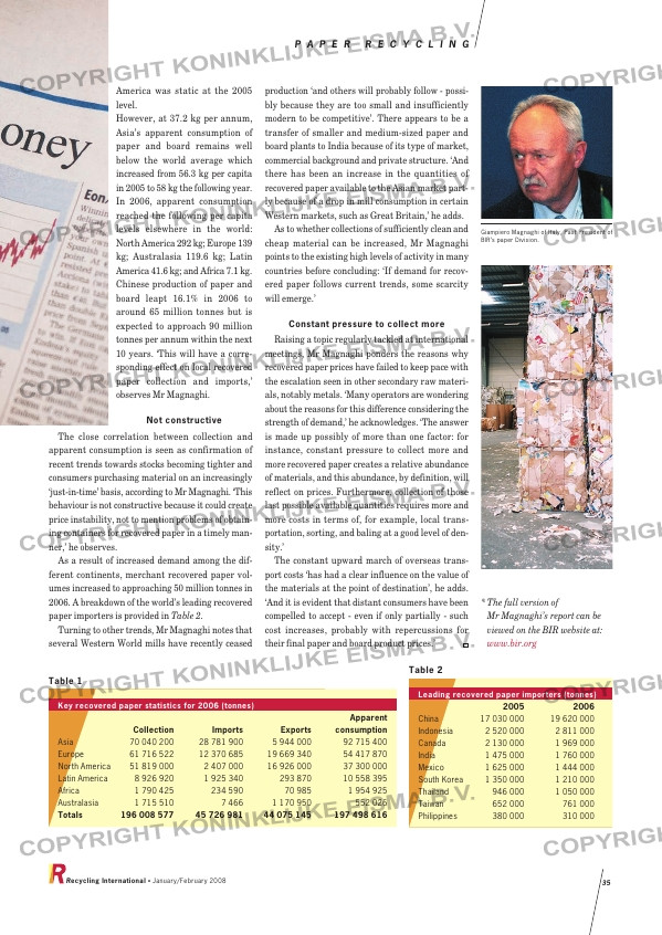 ...evels of activity in many countries before concluding: ‘If demand for recov- ered paper follows current trends, some scarcity will emerge.’ Constant pressure to collect more Raising a topic regularly tackled at international meetings, Mr...