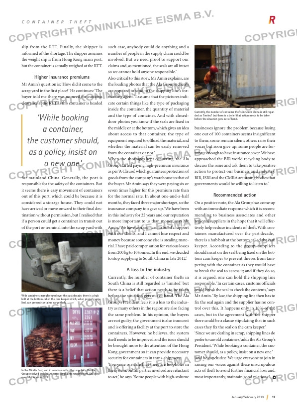 ... decade, there is a hub bolt at the bottom called the cam keeper which, when properly app- lied, can prevent container cargo theft. In the Middle East, and in common with other suppliers, the Ala Group received weight shortage complaints ra...