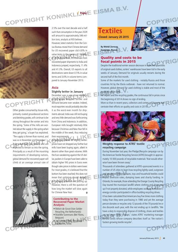 ... focal points in 2015 Despite the traditional winter season decrease in collected quantities of original used clothes, sorters’ warehouses have been full in the early weeks of January. Demand for originals usually restarts during the secon...