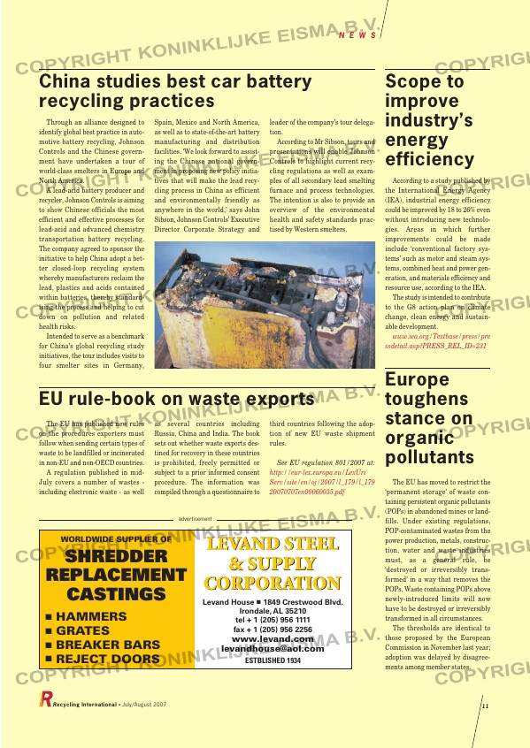 ...d.com [email protected] ESTBLISHED 1934 LEVAND STEEL & SUPPLY CORPORATION advertisement China studies best car battery recycling practices EU rule-book on waste exports The EU has published new rules on the procedures exporters...