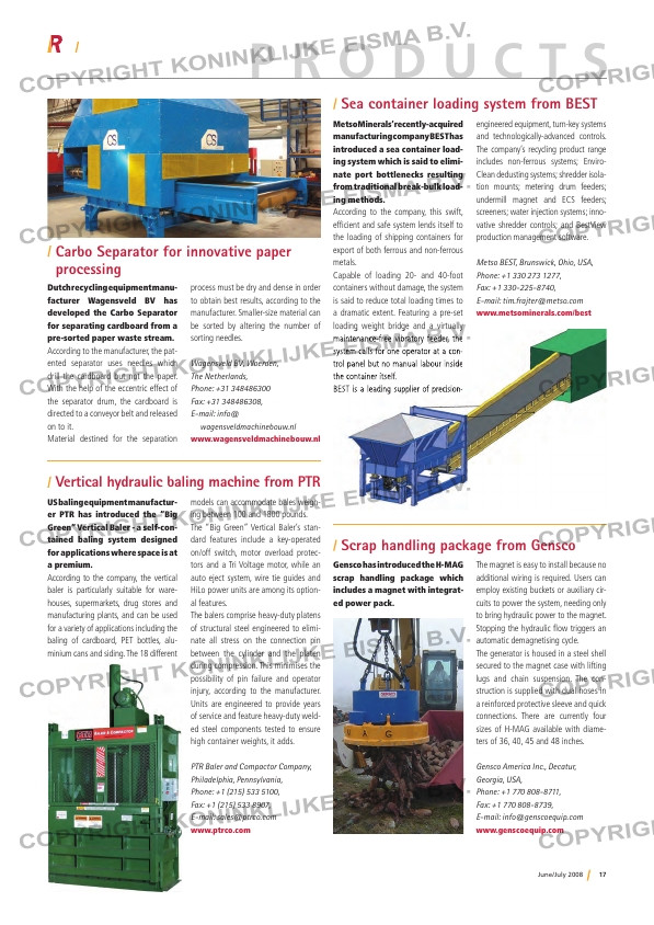 ...scoequip.com Dutch recycling equipment manu- facturer Wagensveld BV has developed the Carbo Separator for separating cardboard from a pre-sorted paper waste stream. According to the manufacturer, the pat- ented separator uses needles whic...
