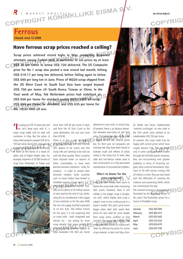 US$ 500 per long ton in June. Prices of 80/20 scrap shipped from