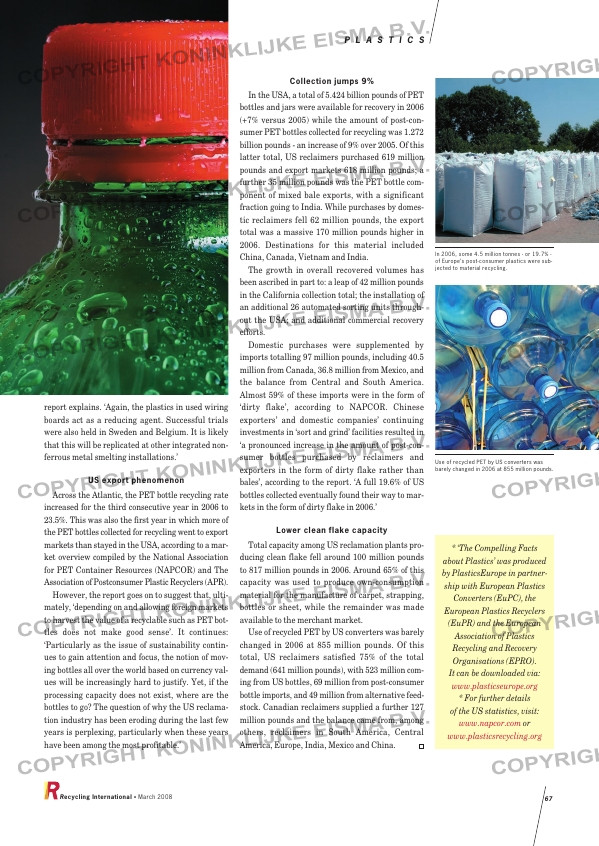 ...million pounds in 2006. Around 65% of this capacity was used to produce own-consumption material for the manufacture of carpet, strapping, bottles or sheet, while the remainder was made available to the merchant market. Use of recycled PET b...