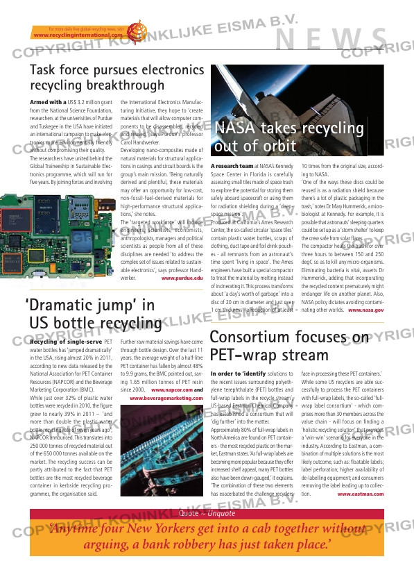 ...ting.com ‘ Dramatic jump’ in US bottle recycling A research team at NASA’s Kennedy Space Center in Florida is carefully assessing small tiles made of space trash to explore the potential for storing them safely aboard spacecraft o...