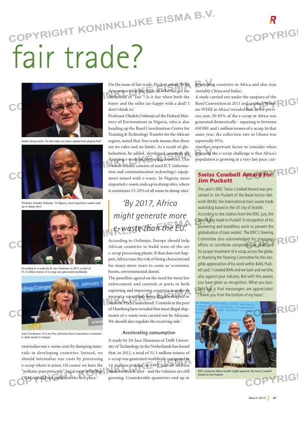 ...ed. Fuchs underlined: ‘Controls in the port of Hamburg have revealed that most illegal ship- ments of e-waste were carried out by Africans. We should also regulate the receiving side.’ Accelerating consumption A study by Dr Jaco Hui...