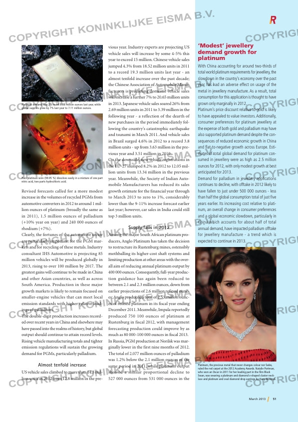 ...ough to March 2013 to zero to 1%, considerably lower than the 9-11% increase forecast earlier last year; however, car sales in India could still top 3 million units. Supply falls in 2012 Among the major South African platinum pro- d...