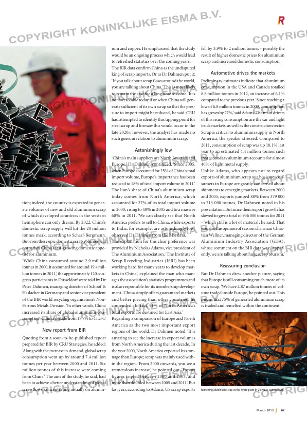 ...on tonnes in 2009, consumption has grown by 27%,’ said Adams. The main drivers of this rising consumption are the car and light truck markets, as well as the construction sector. Scrap is critical to aluminium supply in North Ameri...
