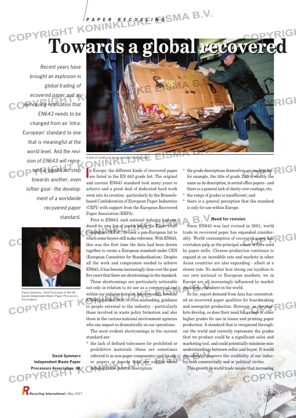 ...andard. David Symmers Independent Waste Paper Processors Association, UK Towards a global recovered p A bale of cardboard being unloaded from a press. David Symmers, Chief Executive of the UK- based Independent Waste Paper Processors ...