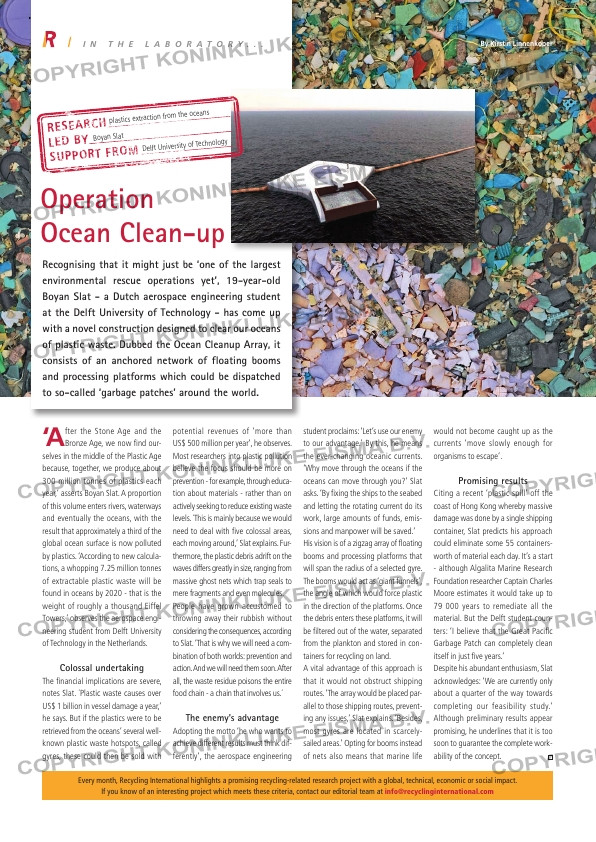 ...par- allel to those shipping routes, prevent- ing any issues,’ Slat explains. ‘Besides, most gyres are located in scarcely- sailed areas.’ Opting for booms instead of nets also means that marine life potential revenues of ‘more tha...