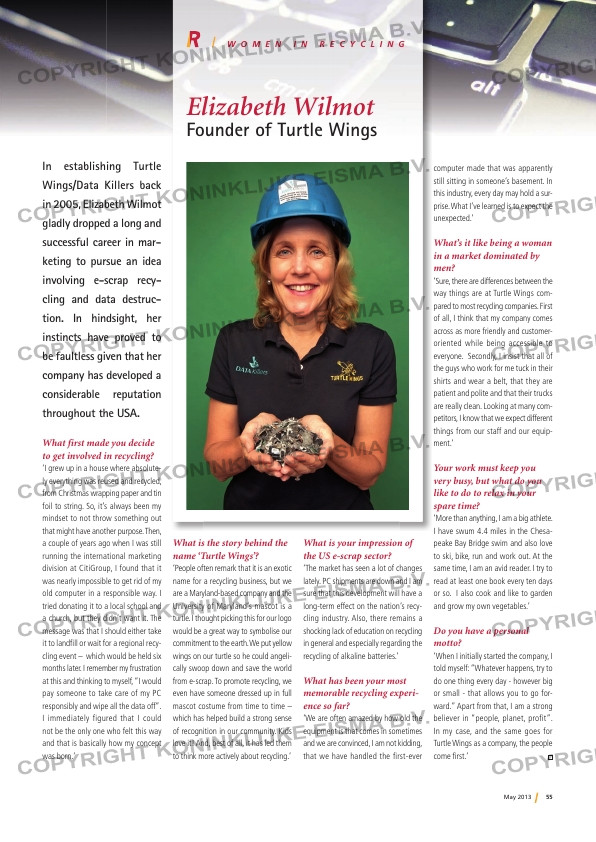 ... In establishing Turtle Wings/Data Killers back in 2005, Elizabeth Wilmot gladly dropped a long and successful career in mar- keting to pursue an idea involving e-scrap recy- cling and data destruc- tion. In hindsight, her inst...