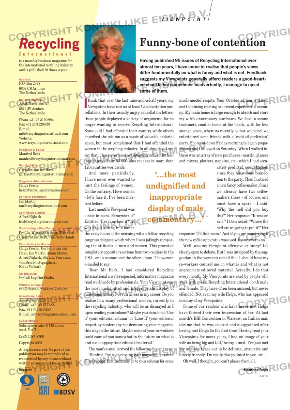 ...essionals. Your Viewpoint was the most undignified and inappropriate display of male commentary I’ve run across in my career. Do you realise how many professional women, currently in the recycling industry, who will be as dismayed as I upon ...