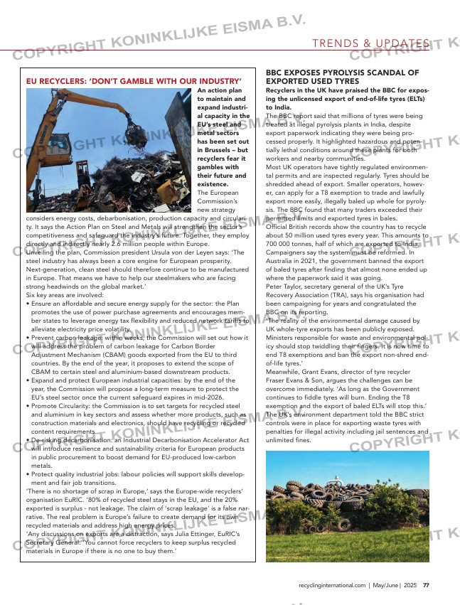 organisation EuRIC. ‘80% of recycled steel stays in the EU, and the 20%