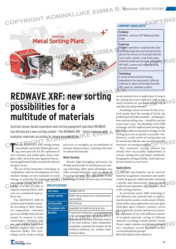 ...dent recognition is possible (for example, for the sorting of aluminium, zinc, stainless steel). Sorting of alloys. recycling rate...