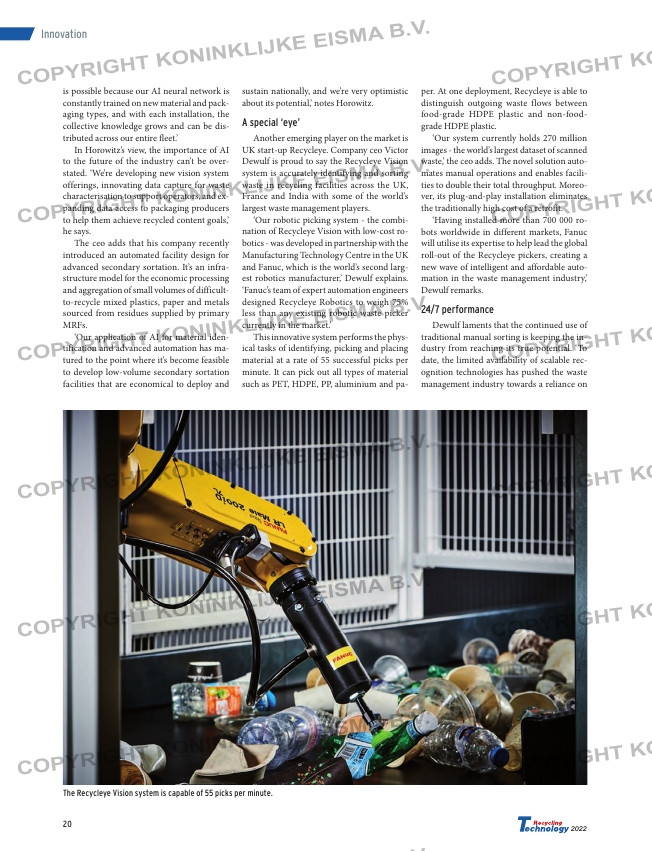 ... The Recycleye Vision system is capable of 55 picks per minute. 18-19-20-21_smartsorting.indd 20 31-08-21 15:56 recycling rate...