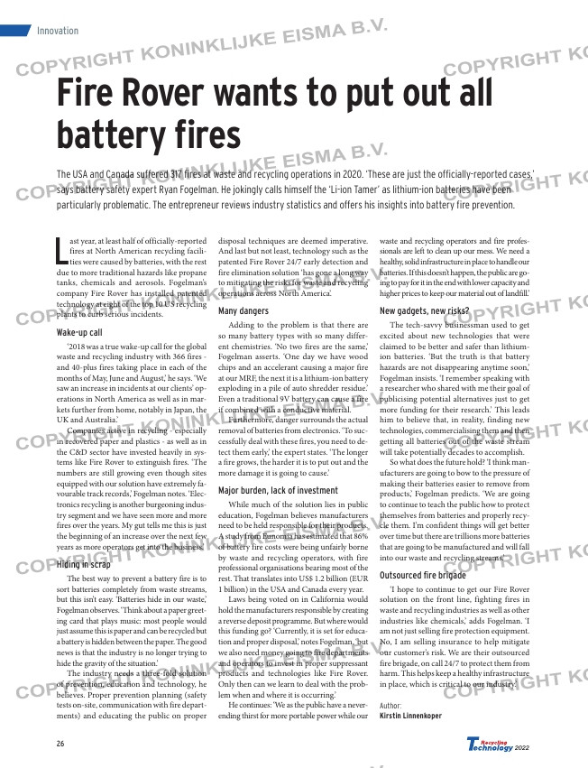 ...� Companies active in recycling - especially in recovered paper and plastics - as well as in the C&D sector have invested heavily in sys- tems like Fire Rover to extinguish fires. ‘The numbers are still growing even though sites equipp...