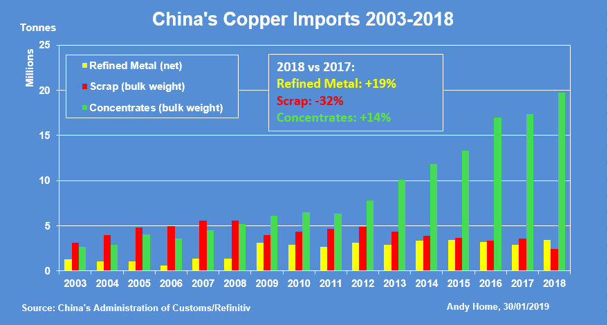 The strength of China’s import appetite is hailed as ‘surprising’ given the country’s own refined copper production increased 8% to just over 9 million tonnes in 2018. Also, new smelting and refining capacity continues to be built. There was no shortage of mined concentrates to feed it last year thanks to a ‘robust performance’ by the world’s copper mines.