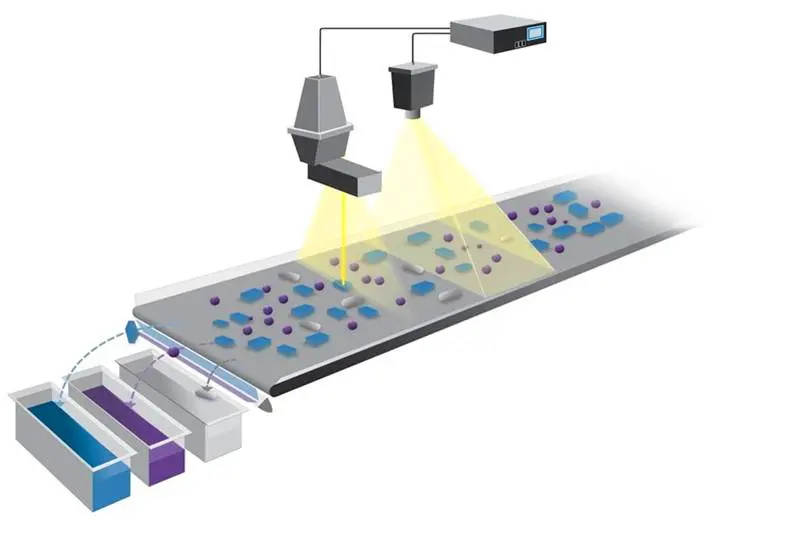 The imaging part of the sorting system consisted of an RGB line camera producing a resolution of 170 µm x 170 µm per pixel. The overall inspection width was 700 mm while halogen lamps were used for illumination.