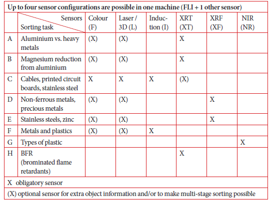 Primarily X-ray transmission sensors are used to sort the Zorba fraction to remove heavy metals and heavy metal alloyed aluminium, with the overriding aim of producing a clean aluminium fraction. If a recycler also uses the machine to sort the Zurik fraction, sensors for colour, laser and induction can be added; this combination allows further sorting stages to be undertaken to produce clean cables, printed circuit boards and stainless steel products (see Table: A+C).